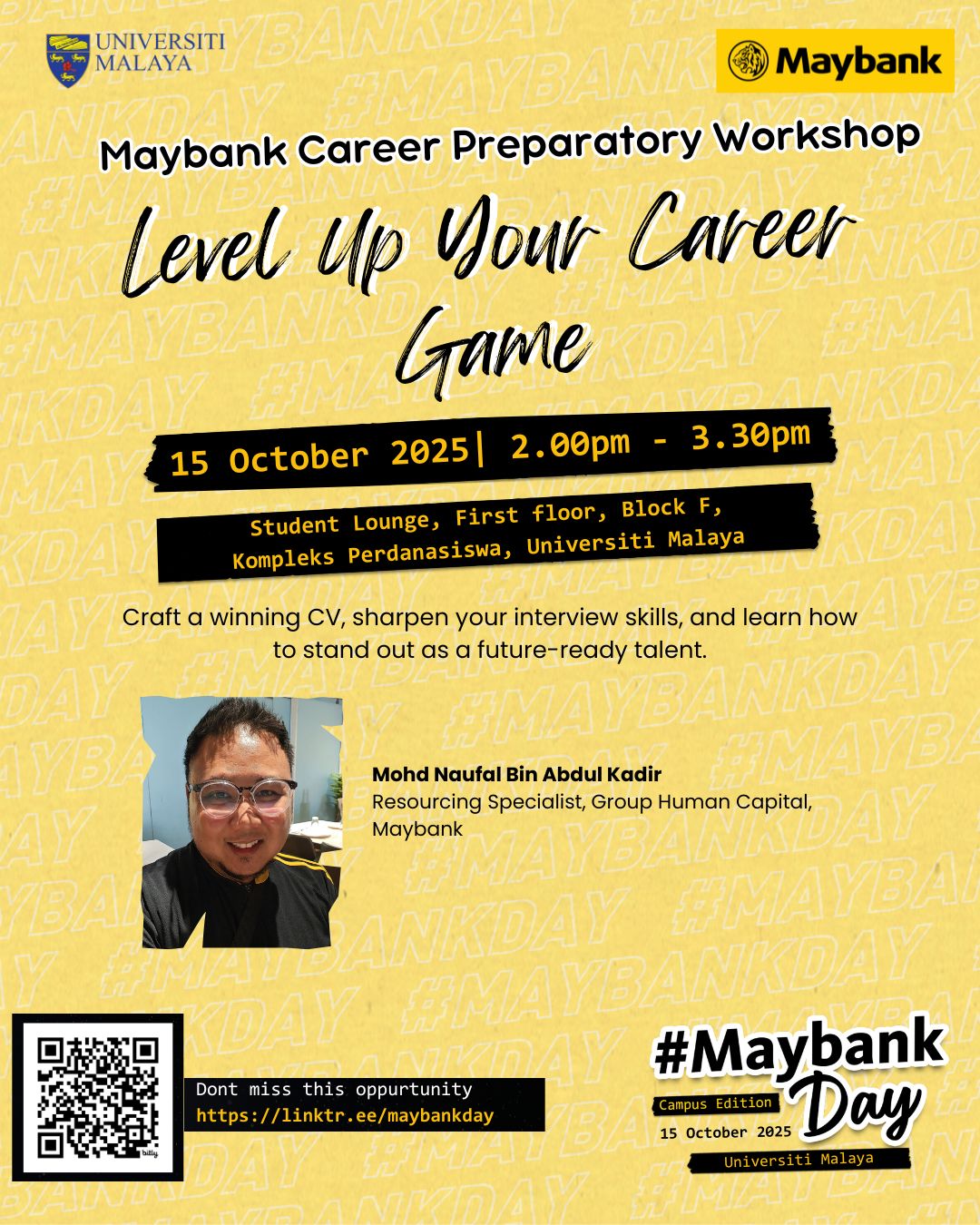Learn how to craft a winning CV, sharpen your interview skills, and stand out as a future-ready talent — all in one practical workshop led by Mohd Naufal Bin Abdul Kadir, Resourcing Specialist,, Maybank. 💛
