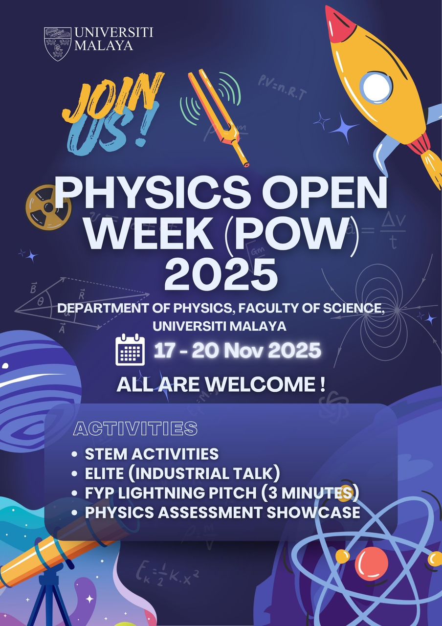 The Department of Physics is pleased to invite all staff and student to participate in the upcoming Physics Open Week 2025 (POW2025), which will be held as follows: