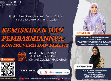 The Royal Professor Ungku Aziz Chair (RPUAC) was established at the Faculty of Economics and Administration, University of Malaya to honor the contributions of Professor Ungku Aziz in the field of education and economic development especially rural development and poverty. The Ungku Aziz Centre for Development Studies, previously known as the Centre for Poverty and Development Studies (CPDS), is created to facilitate the activities of the chair. Since 2016, the Centre has undertaken steps to develop and further expand the field of development studies to reflect its interdisciplinary nature, to attract a wider participation, to engage young minds and to go beyond a mono-disciplinary approach to development. The defining pillars of the Ungku Aziz Centre for Development Studies represents the Centre’s evolution and the dynamism of the field of study.